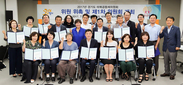 강득구 연정부지사(앞줄 가운데)가 24일 오후 경기도 따복공동체지원센터 3층 교육장에서 열린 ‘2017년 경기도 따복공동체위원회 위원 위촉 및 제1회 회의’에서 위촉된 경기도 따복공동체위원회 위원들과 함께 기념촬영을 하고 있다. /경기도 제공