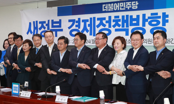 더불어민주당 우원식 원내대표(오른쪽 다섯번째)와 김동연 경제부총리 겸 기획재정부 장관(오른쪽 여섯번째) 등 더불어민주당 의원과 경제장관들이 24일 오전 서울 여의도 국회 의원회관에서 열린 새정부 경제정책방향 당정협의에 참석해 손을 맞잡고 있다./연합뉴스