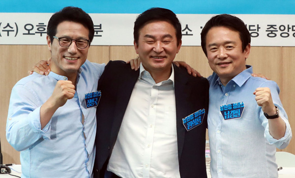 26일 오후 서울 여의도 바른정당 당사에서 열린 ‘남원정 앵콜쇼’에서 정병국 전 대표(왼쪽부터), 원희룡 제주지사, 남경필 경기지사가 토론에 앞서 포즈를 취하고 있다./연합뉴스