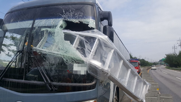 화물차 낙하 철제 사다리에 달리던 관광버스 날벼락