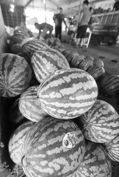 폭염과 집중호우에 따른 출하량 변화와 품질별 가격 차이로 수박값 변동이 심한 가운데 2일 오후 인천시 부평구 삼산농산물도매시장 경매장에 수박이 들어오고 있다. /연합뉴스