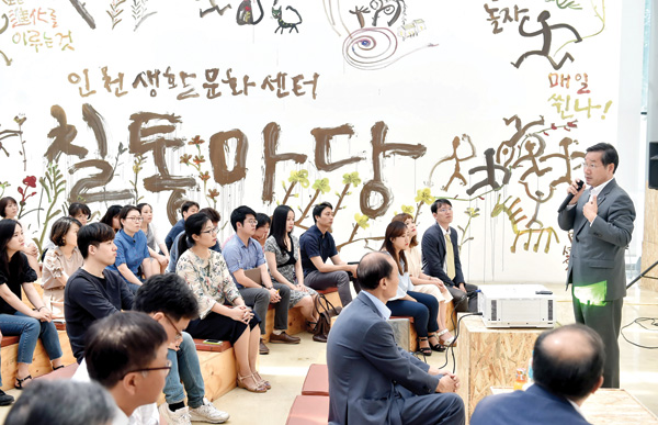 유정복 인천시장이 3일 아트플랫폼에서 열린 ‘2017 인천문화재단 지역과의 대화’에서 문화재단 임직원들을 대상으로 ‘우리는 애인(愛仁), 우리는 인천’을 주제로 특강을 하고 있다. /인천시 제공