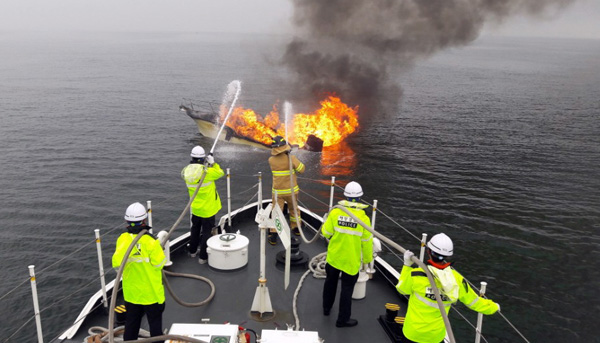 6일 오전 8시께 경기도 화성시 입파도 북서쪽 약 900m 해상에서 일가족 5명이 타고 있던 3t급 레저 보트에서 불이 나 김모(42)씨 부부와 딸(15) 등 4명이 얼굴 등에 화상을 입는 등 다쳐 병원에서 치료를 받고 있다. 이들은 해경 조사에서“배 안에서 휴대용 가스레인지를 켜는 순간 ‘펑’하고 폭발하더니 배로 불이 옮겨붙었다” 진술한 것으로 전해졌다. /평택해경 제공