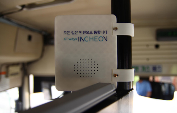 인천시는 피로에 시달리는 버스 기사를 위해 하차 벨 알림음을 시민의 응원 음성으로 꾸민 ‘해피버스(BUS)데이’를 7일부터 운행한다. 대상은 8번 버스 2대, 511번 버스 2대 등 총 4대로 해피버스에서는 승객이 목적지에 내리기 위해 벨을 누르면 단순한 알림음 대신 “기사님, 엄지 척 기운 팍!”, “기사님 힘을 내요. 슈퍼파월~” 등 톡톡 튀는 응원 음성이 나온다. 사진은 시민 응원 음성 방송 스피커. /인천시 제공