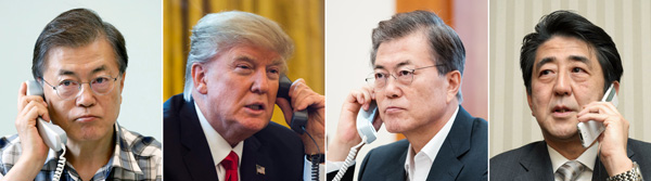 문재인 대통령이 7일 오전 청와대에서 도널드 트럼프 미국 대통령과 통화를 한 후 오후에는 아베 신조 일본 총리와 통화하고 있다. 트럼프 미 대통령과 아베 일본 총리는 자료사진./청와대제공, 연합뉴스