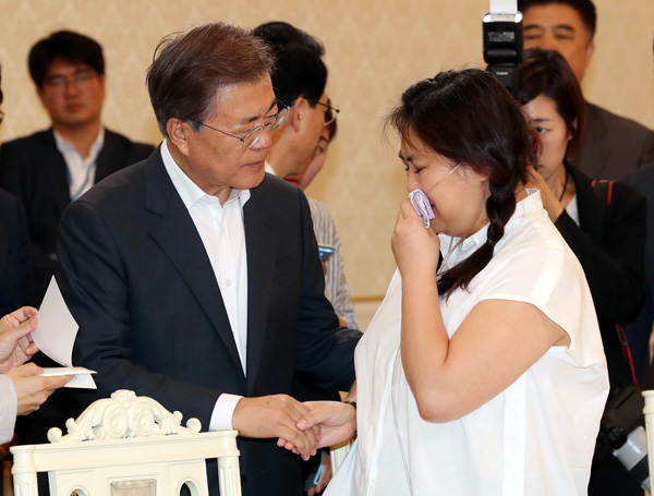 문재인 대통령이 8일 오후 청와대 인왕실에서 열린 가습기 살균제 피해자와의 면담에서 울먹이는 피해자 조순미 씨의 손을 잡고 위로하고 있다. /연합뉴스