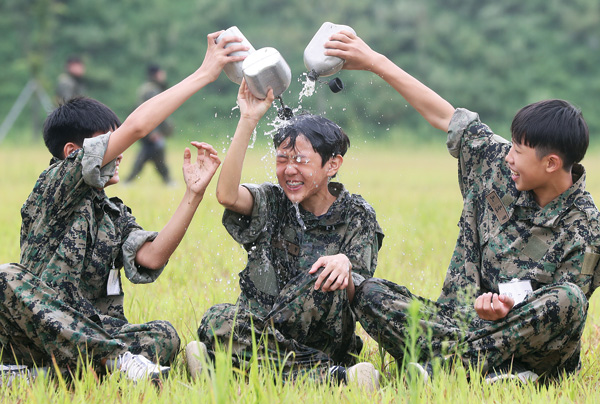 9일 오전 이천시 마장면 3공수특전여단에서 열린 ‘특전사 하계 특전캠프’에서 참가자들이 훈련을 마치고 수통의 물을 뿌리며 더위를 식히고 있다./연합뉴스