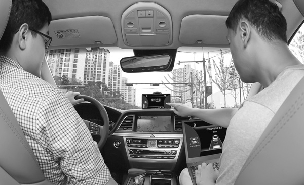 현대·기아차는 화성시내 약 14㎞ 구간 총 7개 교차로에 ‘차량과 사물간 통신’ 인프라 구축을 완료하고 본격적인 V2X 서비스 검증 및 연구를 시작한다고 15일 밝혔다. V2X는 차량을 중심으로 무선 통신을 통해 각종 교통·도로상황·차량·보행자 정보를 교환하고 공유하는 기술이다. 사진은 연구원들이 차량 내부에서 ‘교차로 교통신호 정보 서비스’를 테스트하는 모습./연합뉴스