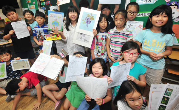 16일 오전 동수원초등학교에서 개학을 맞은 아이들이 방학과제를 들어보이고 있다. /김수연기자 foto92@