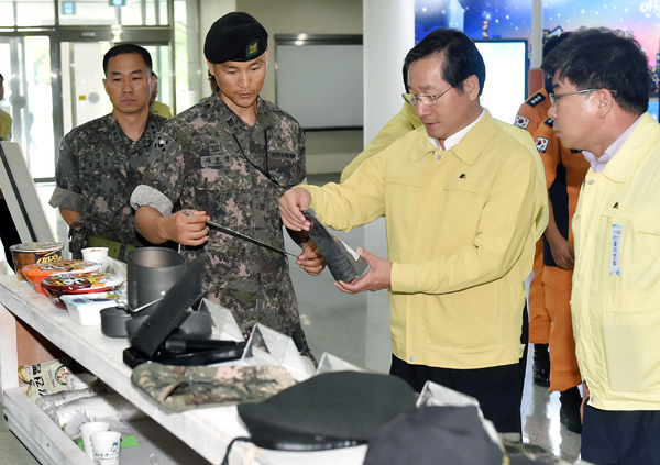 유정복 인천시장이 21일 시청 종합상황실에서 ‘2017 을지연습 최초 상황보고’를 받고 안보장비 전시장를 참관하고 있다. /인천시 제공