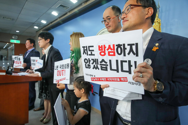 22일 오후 국회 정론관에서 열린 국회의원 국민소환제 제정 촉구를 위한 기자회견에서 법안을 발의한 더불어민주당 박주민·박재호 의원이 시민들과 함께 기자회견을 하고 있다./연합뉴스