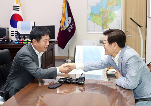 22일 정찬민 용인시장(왼쪽)이 성남시청을 방문, 이재명 시장과 보편적 복지에 대한 환담에 앞서 반갑게 악수하고 있다./성남시 제공
