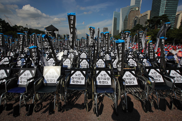 한국노인복지중앙회, 한국노인장기요양기관협회 등 노인복지 관련단체 종사자들이 22일 오후 서울 여의도공원 문화마당에서 집회를 열고 정부의 치매국가책임제 관련 본인부담상한제 도입을 촉구하고 있다. 이날 참가자들은 대통령의 5개년 국정과제에 본인부담상한제가 본인부담 경감 확대로 표현된 것과 관련해 우려를 표시하기 위해 "노인장기요양 죽였다"라고 쓴 영정모양 피켓을 휠체어에 올려 집회장 한가운데 세워뒀다./연합뉴스