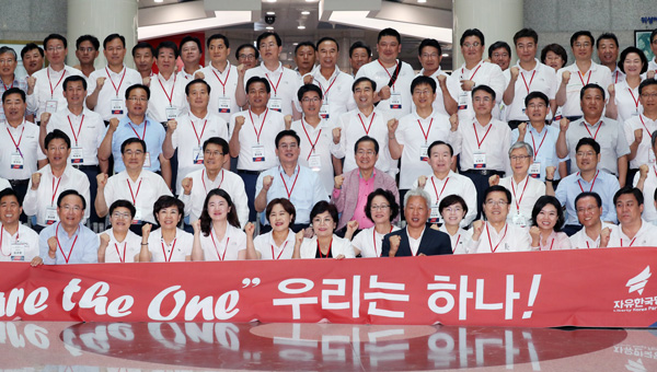 자유한국당 홍준표 대표와 정우택 원내대표 등이 24일 오후 충남 천안시 우정공무원교육원에서 열린 제2차 국회의원·당협위원장 연석회의에서 기념촬영을 하고 있다. /연합뉴스
