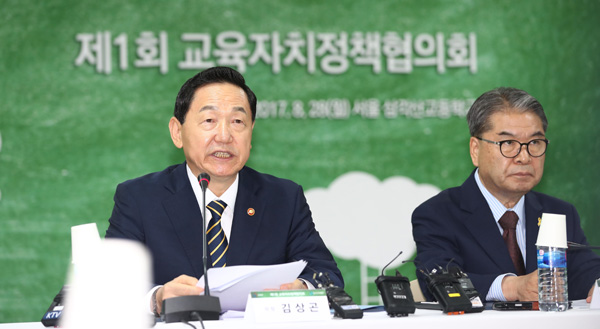 김상곤 사회부총리 겸 교육부 장관(왼쪽)이 28일 오후 서울 강북구 삼각산고등학교에서 열린 제1회 교육자치정책협의회에서 모두발언을 하고 있다. 오른쪽은 이재정 경기도교육감./연합뉴스