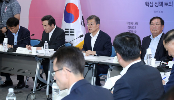 문재인 대통령이 30일 오후 세종특별자치시 정부세종청사에서 열린 ‘농식품부ㆍ해양수산부 핵심정책 토의’에서 발언하고 있다. /연합뉴스