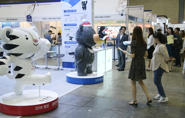 31일 고양시 킨텍스 제1전시장에서 열린 대한민국 행정홍보대전에서 관람객이 2018평창 올림픽 마스코트인 수호랑(왼쪽)과 평창 패럴림픽 마스코트인 반다비 앞을 지나가고 있다. /연합뉴스