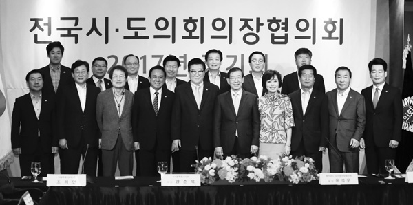 31일 오후 서울 중구 소공동 롯데호텔에서 열린 전국 시·도의회의장협의회 2017년 정기회에서 조희연 서울시교육감(앞줄 왼쪽 세번째부터), 양준욱 서울시의회의장, 윤석우 전국 시·도의회의장협의회장, 박원순 서울시장이 기념촬영을 하고 있다. /연합뉴스