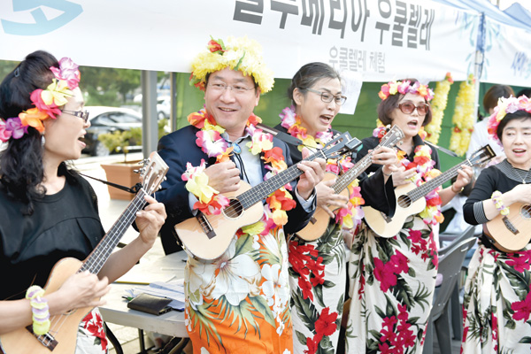 유정복 인천시장이 지난 2일 아트플랫폼에서 열린 ‘제1회 인천생활문화축제 사이다’에서 동구 플루메리아 우쿨렐레팀과 진주조개잡이 알로하오에 연가를 함께 연주하고 있다. /인천시 제공