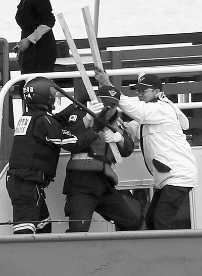 5일 오전 인천시 서구 경인아라뱃길 인천터미널에서 열린 ‘해양경찰청 불법외국어선 단속역량 경연대회’에서 해양경찰 서해5도특별경비단 대원들이 불법조업 외국어선에 올라 선원들을 제압하는 시연을 하고 있다. /연합뉴스