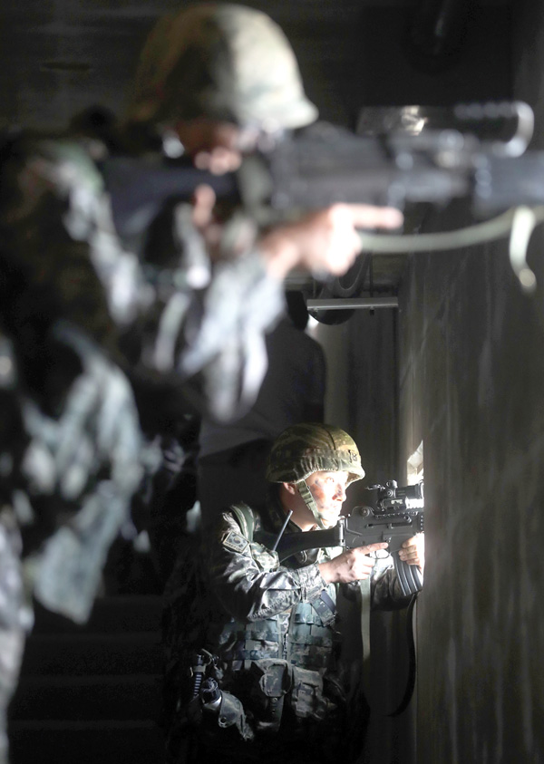 인천시 옹진군 백령도에서 해병대 서북도서방위사령부 주관으로 7일 계속된 서북도서방어훈련에서 해병대 6여단 장병들이 적 침투상황을 가정해 훈련하며 호 안에서 해안선을 감시하고 있다. /연합뉴스