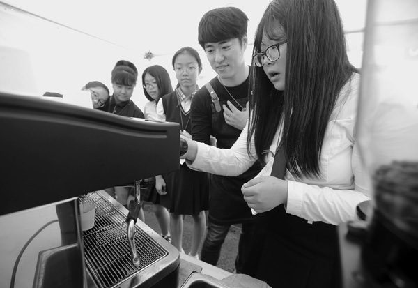 7일 오후 군포시 군포시민체육광장에서 열린 ‘제2회 청소년진로박람회’에 모인 학생들이 배추 커피 만들기 체험을 하고 있다. /연합뉴스