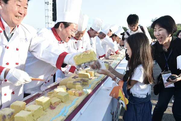 유정복 인천시장이 지난 9일 문학경기장 동문광장에거 열린 ‘2017년 인천음식문화박람회’에서 한 어린이에게 기념 떡을 나누어 주고 있다. /인천시 제공