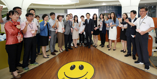 남경필 도지사가 지난 8일 도민의 고충을 직접 듣고 해결방안을 모색하는 ‘도지사 좀 만납시다’ 100회 민원상담을 마친 후 직원들에게 장미꽃을 전달하고 함께 파이팅을 외치고 있다. /경기도 제공