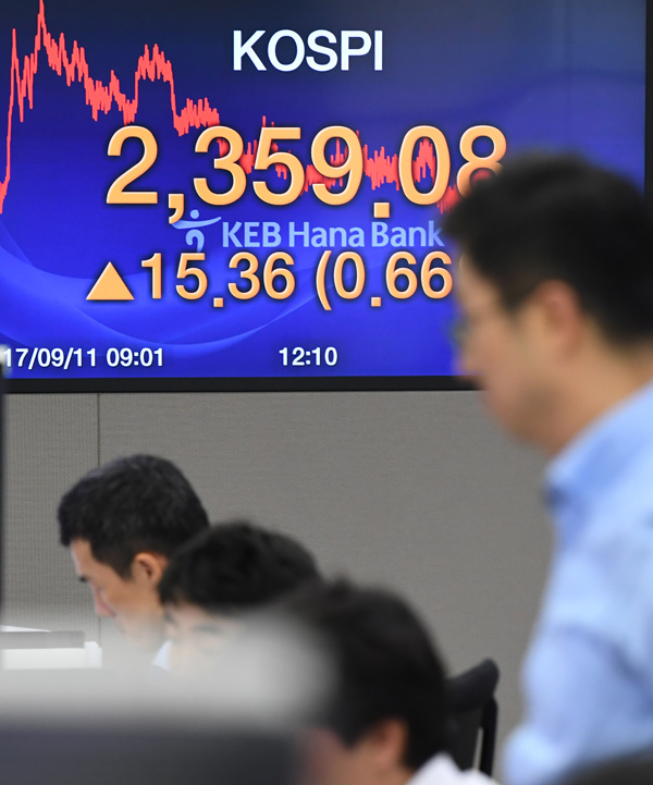11일 오후 서울 명동 KEB하나은행 딜링룸에 이날 코스피 종가가 표시 돼 있다. 코스피는 기관의 매수세로 2,359.08로 마감됐다./연합뉴스