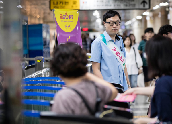 11일 오후 서울 혜화역에서 지하철 관계자가 부정승차 단속을 하고 있다. 서울 지하철 1∼8호선을 운영하는 서울교통공사는 코레일, 인천교통공사, 공항철도, 서울9호선 등과 이날부터 이달 22일까지 부정승차 단속을 이어간다고 8일 밝혔다. /연합뉴스
