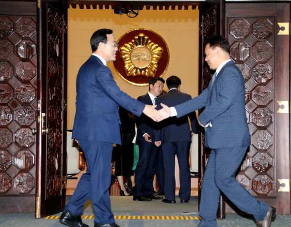 바른정당 주호영 원내대표(왼쪽)와 국민의당 이용주 의원이 11일 오후 국회 본회의에 참석하기 전 본회의장 앞에서 인사하고 있다.
