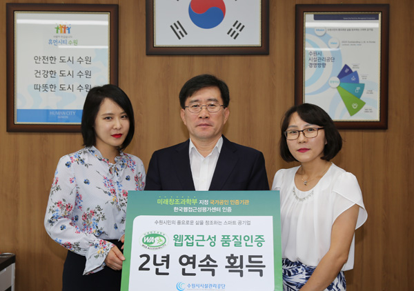 수원시시설관리공단은 미래창조과학부 지정 전문평가 기관인 한국웹접근성 평가센터에서 2년 연속 ‘홈페이지 웹 접근성 품질인증마크’를 획득했다고 13일 밝혔다. 웹 접근성 품질인증은 ‘국가정보화기본법’이 정한 기준 준수는 물론, 장애인 및 고령자(사회적약자, 정보취약계층)의 웹 사이트 이용불편 최소화를 위해 노력한 우수기관 홈페이지에 부여하는 국가 공인 인증 마크다.
