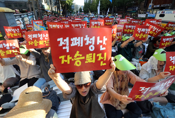 14일 서울 종로구 조계사 앞에서 열린 조계종 적폐청산 범불교도대회에서 참석자들이 ‘적폐청산, 자승퇴진’이라고 인쇄된 손팻말을 들고 구호를 외치고 있다./연합뉴스