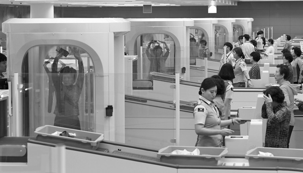 14일 오전 인천공항 제2여객터미널에서 열린 종합 시험운영 점검에서 승객들이 전신검색대를 통과하고 있다./연합뉴스