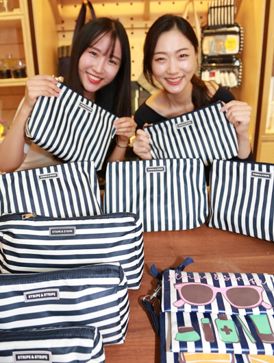 16일 성남시 분당구 AK플라자 분당점에서 사내모델들이 ‘스트라이프&스트라이프 트래블 파우치’ 스페셜 한정판 에디션 사은품을 선보이고 있다. 사은품은 오는 27일까지 10만원 이상 구매고객 선착순 2천500명에게 무료 증정한다./연합뉴스