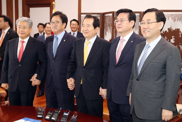 정세균 국회의장과 여야 4당 원내대표들이 19일 오후 국회의장실에서 진통을 겪고 있는 김명수 대법원장 임명동의안 처리 방안을 논의하기 위해 회동하고 있다. 왼쪽부터 국민의당 김동철, 더불어민주당 우원식, 정세균 국회의장, 자유한국당 정우택, 바른정당 주호영 원내대표./연합뉴스