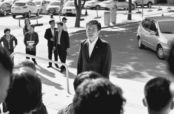 전성수 행정부시장이 21일 시청 본관 현관 앞에서 시도 공무원 친선체육대회 출전하는 선수단 대표를 격려하고 있다. /인천시 제공