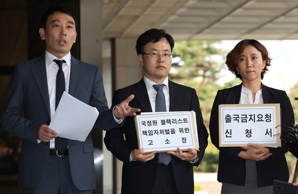 이명박 정부 당시 국가정보원의 ‘블랙리스트’에 올라 차별을 받은 것으로 알려진 피해 문화예술인들이 이명박 전 대통령 등 관련자들을 검찰에 고소했다. 국정원 문화계 블랙리스트 책임자 처벌을 위한 고소 대리인단이 25일 오후 서울 서초동 서울중앙지검 앞에서 고소장 제출에 앞서 기자회견을 하고 있다./연합뉴스