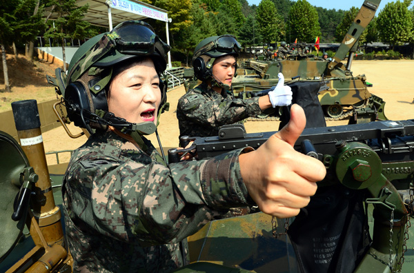 더불어민주당 추미애 대표가 26일 오전 9사단 전차대대를 방문, 전차에 탑승해 엄지를 치켜들고 있다./연합뉴스