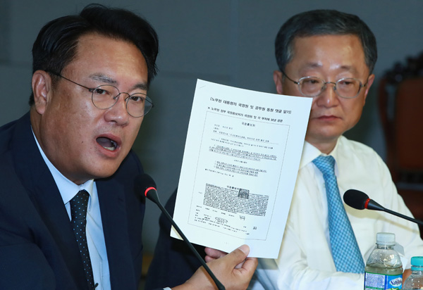 자유한국당 정진석 의원이 27일 오전 국회 의원회관에서 열린 ‘열린토론, 미래’ 정례 토론회에 참석해 노무현 정부 당시 국정홍보처가 국정원 및 각 부처에 보낸 ‘국정브리핑 언론보도종합 부처의견 관련 협조 요청’ 공문을 들어보이고 있다./연합뉴스