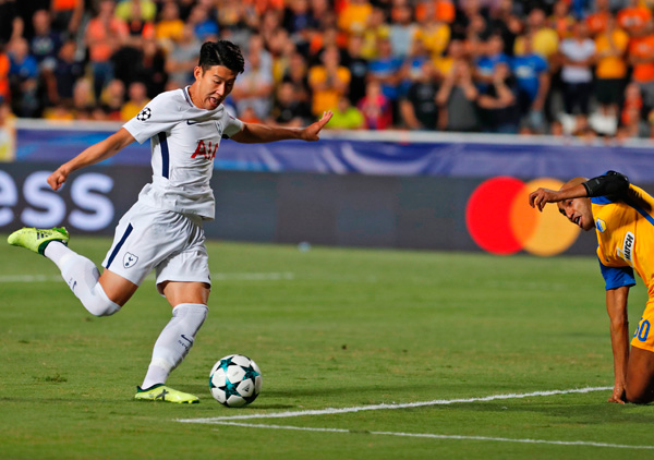 27일 키프로스 니코시아 GSP 스타디움에서 열린 2017~2018 유럽축구연맹(UEFA) 챔피언스리그 조별리그 H조 2차전 토트넘(잉글랜드)과 아포엘의 경기에서 토트넘의 손흥민이 슛을 시도하고 있다./연합뉴스