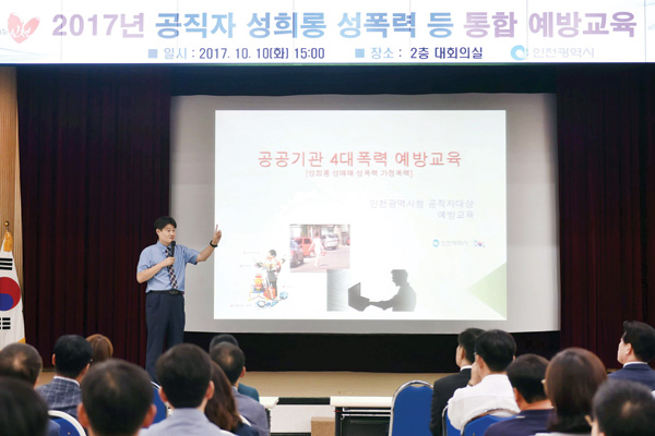 한국범죄학연구소 염건령 교수가 10일 인천시청 대회의실에서 ‘성희롱 성매매 성폭력 가정폭력 통합예방교육’ 강의를 하고 있다. /인천시 제공