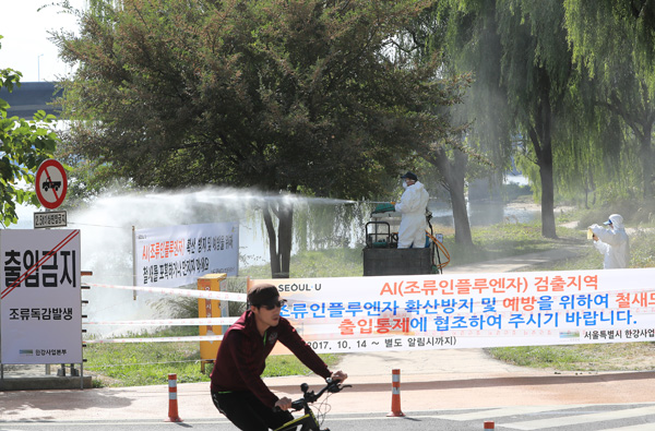 15일 오후 서울 성동구 중랑천에서 한강사업본부 및 성동구보건소 직원들이 조류 분변에서 AI 항원이 검출된 것과 관련해 소독을 실시하고 있다. 서울 강서구 강서습지생태공원과 성동구 중랑천에서 최근 채취한 야생조류 분변에서 H5형 AI 항원이 검출된 바 있다./연합뉴스