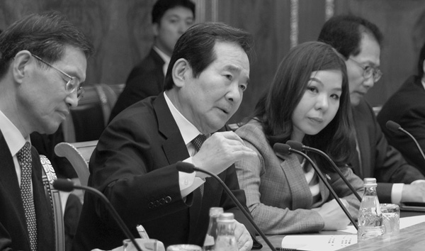 러시아를 방문 중인 정세균 국회의장이 12일 모스크바 하원 청사에서 열린 뱌체슬라프 볼로딘 러시아 하원 의장과 회담에서 인사말을 하고 있다. /연합뉴스
