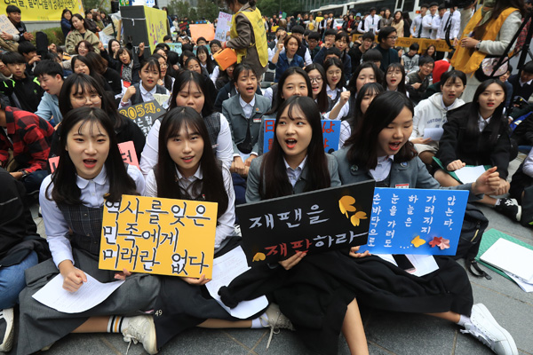 18일 오후 서울 종로구 주한일본대사관 앞에서 한국정신대문제대책협의회(정대협) 주최로 열린 ‘일본군 성노예 문제 해결을 위한 정기 수요시위’에서 참가자들이 위안부 문제 해결을 촉구하고 있다. /연합뉴스