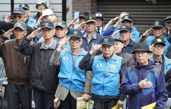 18일 오전 인천시 중구 자유공원 인천학도의용대호국기념탑 앞에서 열린 ‘제19회 인천학도의용대 전사자 및 작고회원 합동추모제’에서 학도의용대 회원들이 경례하고 있다. /연합뉴스