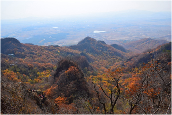 우리는 마침내 파란곡절 끝에 운조봉 정상에 있는 정자까지 도착했다. 산 우에서 보이는 시야는 넓고도 넓어 밑에 있는 산고개들, 오색으로 물들여진 나무들 그리고 더 나아가 호수도 보였고 일망무제한 들까지 한눈에 안겨왔다.