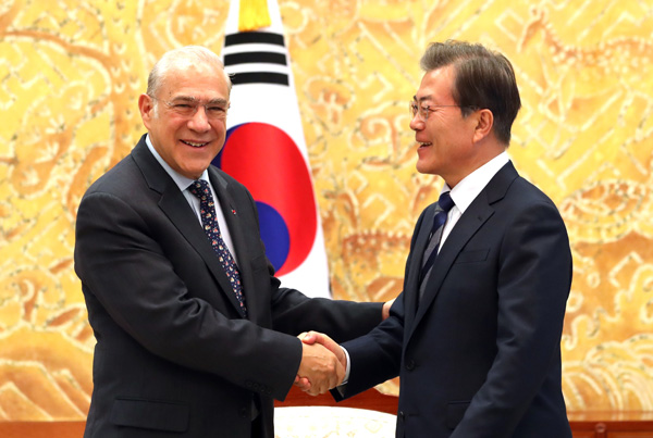 문재인 대통령이 19일 오후 청와대에서 방한 중인 앙헬 구리아 OECD 사무총장을 만나 인사하고 있다./연합뉴스