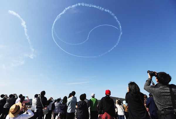 22일 오전 성남시 서울공항에서 열리고 있는 ‘서울 국제 항공우주 및 방위산업 전시회’(서울 ADEX)에서 공군 특수비행팀 블랙이글스가 하늘에 태극을 그리고 있다./연합뉴스