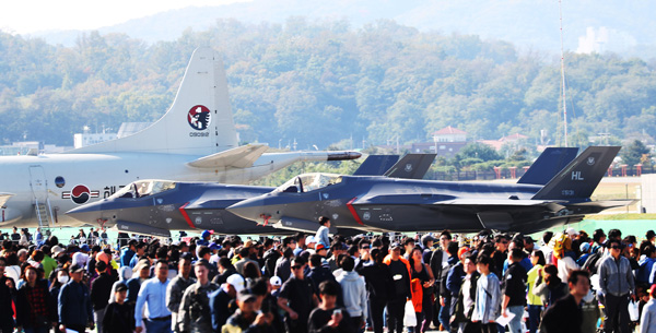 22일 오전 성남시 서울공항에서 열리고 있는 '서울 국제 항공우주 및 방위산업 전시회'(서울 ADEX)를 찾은 시민들이 전시된 전투기 등을 관람하고 있다. /연합뉴스